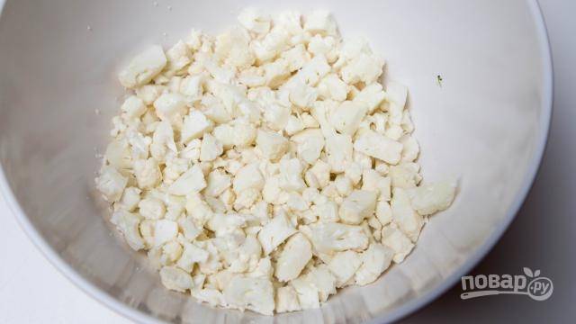 1. Вымойте и измельчите цветную капусту, нарежьте тонкими ломтиками огурчики, а помидоры разрежьте на 4 части.