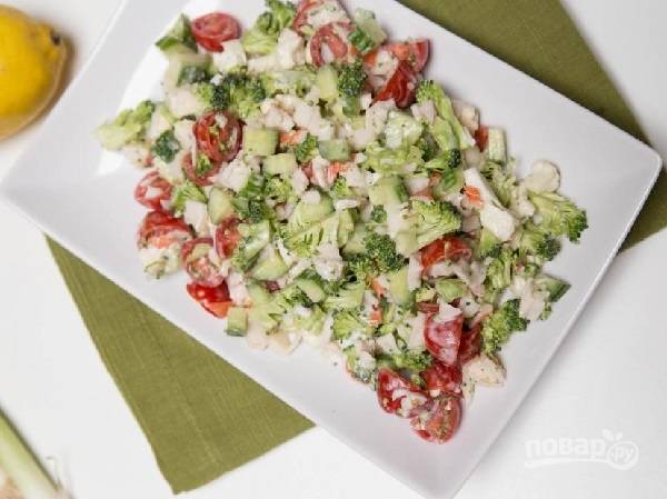 2. Измельчите брокколи и крабовые палочки. Соедините все ингредиенты и перемешайте.