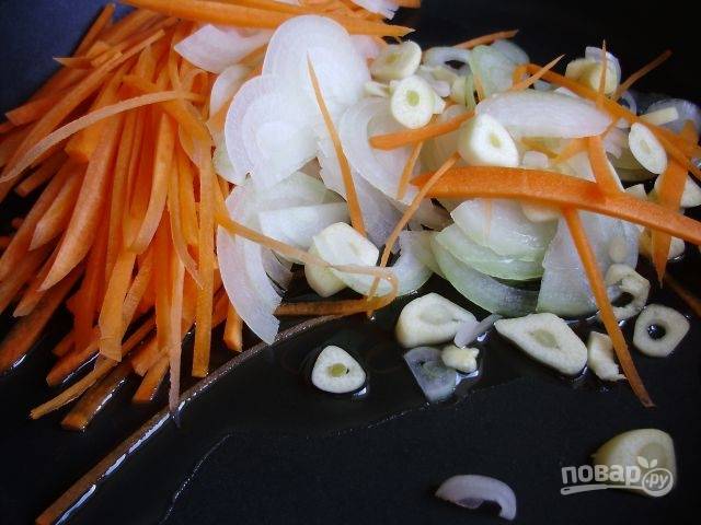 Лук и морковь почистите и вымойте. Нарежьте лук полукольцами, а морковь нашинкуйте полосками при помощи острого ножа или же специальной насадки на терке. Разогрейте в сковороде растительное масло и пассеруйте на нем овощи до готовности.