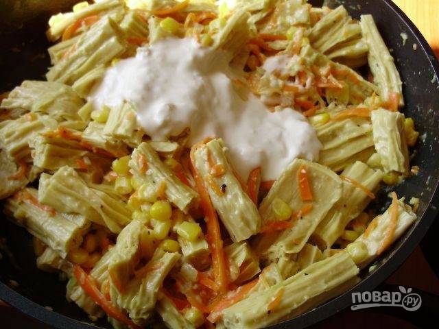 К овощам добавьте консервированную кукурузу и спаржу. Посолите и поперчите по вкусу. Тушите ингредиенты под крышкой десять минут, затем заправьте все майонезом и подавайте к столу.
