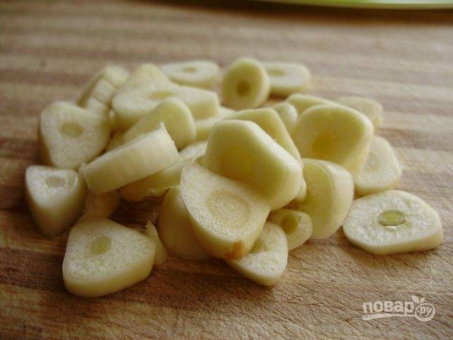Чеснок очистите и нарежьте на слайсы. Также можно просто раздавить зубчики плоской стороной лезвия ножа, чтобы они отдали свой аромат.