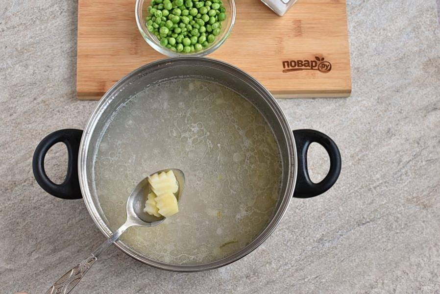Опустите в кипящий бульон нарезанный картофель и варите 5 минут.