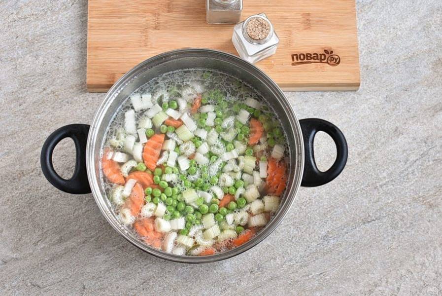 Добавьте нарезанные ломтиками морковь и черешки сельдерея, замороженный горошек и нарезанную белую часть зеленого лука. При желании добавьте чуть сахара, он сделает цвет и вкус овощей немного ярче. Варите 5 минут.