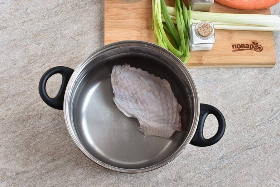 Сварите бульон. Залейте крыло холодной водой, доведите до кипения, снимите пену. Уменьшите огонь до минимума и варите бульон до мягкости мяса, около часа. Посолите по вкусу. Достаньте мясо и снимите его с кости, разобрав на мелкие кусочки. Отложите пока.