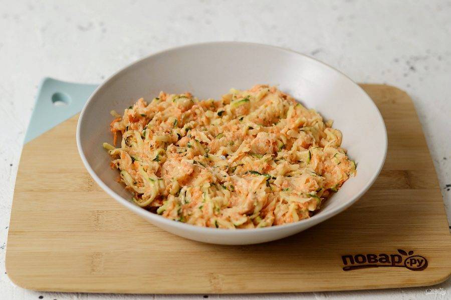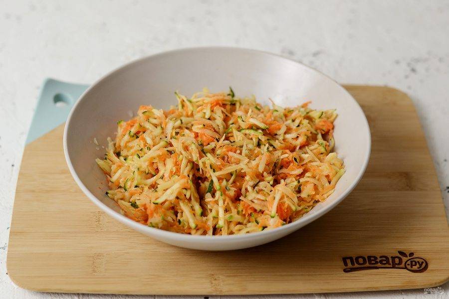 Очищенный картофель и цукини натрите на крупной терке. На мелкой натрите очищенную морковь, лук и чеснок. Посолите и поперчите овощи, перемешайте.