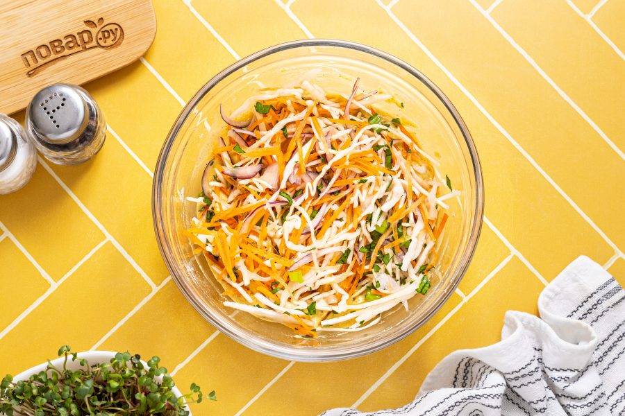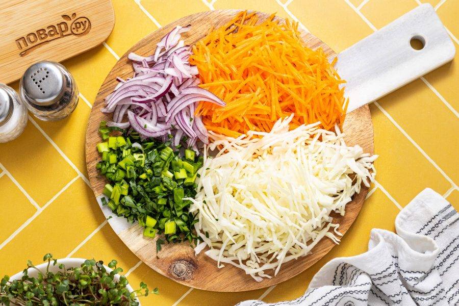 Тонко нашинкуйте капусту. Морковь очистите и натрите на терке. Я использую терку для моркови по-корейски. Красный лук нарежьте перьями. Зелень мелко измельчите.