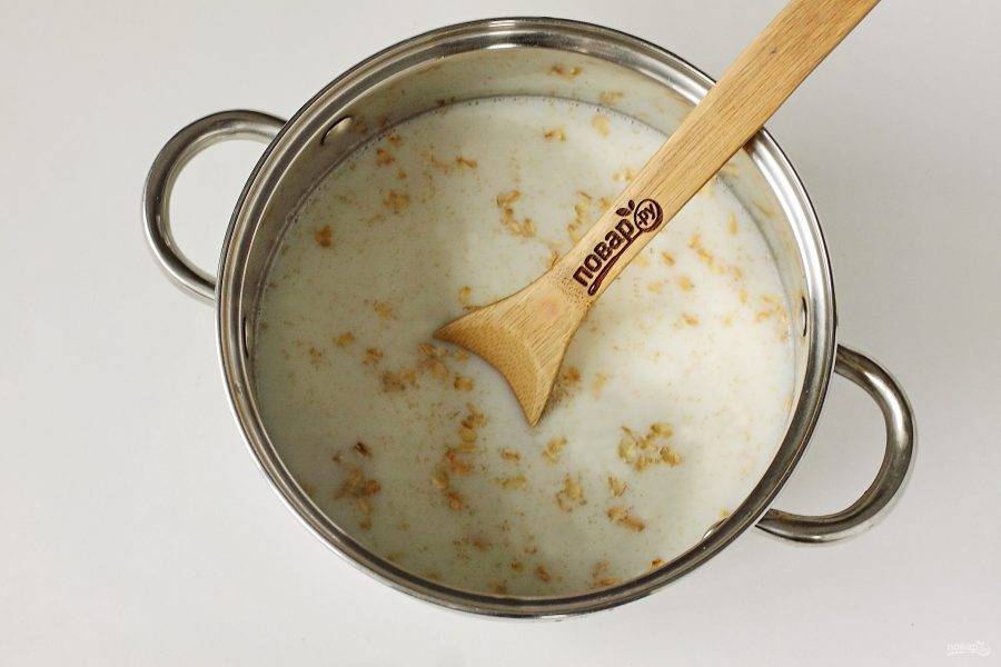 Влейте к овсянке молоко и сливки. Помешивая на небольшом огне доведите до кипения.