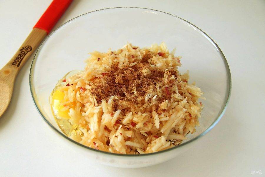 Добавьте тертые на крупной терке яблоки и корицу. Если яблоки сильно сочные, то предварительно их отожмите руками.