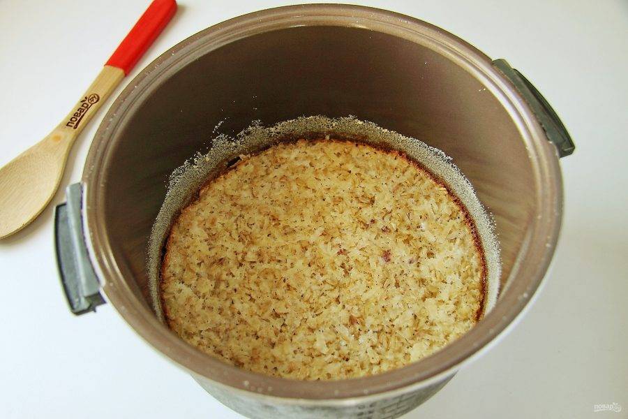 Форму для выпечки смажьте маслом и присыпьте дно и бока манкой. Если сомневаетесь в покрытии своей чаши, то лучше предварительно застелите ее пекарской бумагой так, чтобы края бумаги выступали чуть выше уровня запеканки (за них можно будет взяться и извлечь запеканку без особых хлопот). Выложите сверху готовую массу и разровняйте ее ложкой или лопаткой.