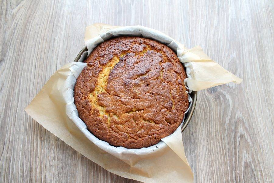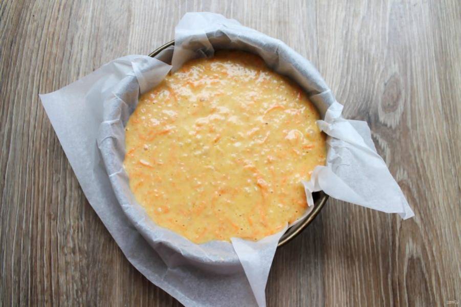 Форму для запекания диаметром 22 сантиметра застелите бумагой для выпечки и переложите в нее тесто, разровняйте.