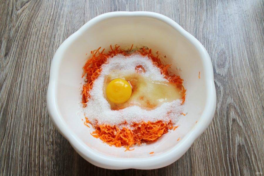 Морковь почистите и натрите на средней терке. Добавьте ее в миску с замоченными хлопьями.