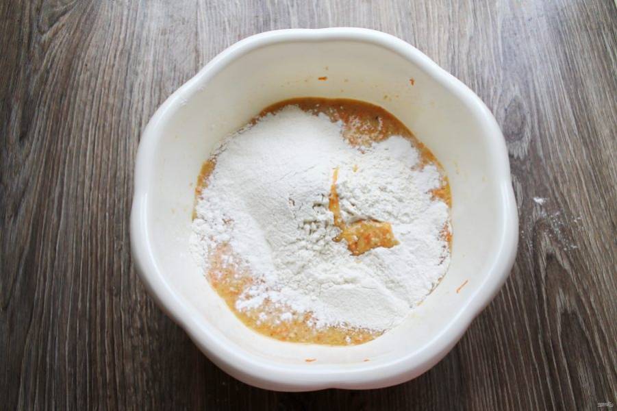 Муку смешайте с разрыхлителем и просейте в миску. Все перемешайте до густого теста.
