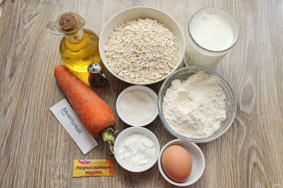 Подготовьте все необходимые ингредиенты для приготовления овсяно-морковного пирога.