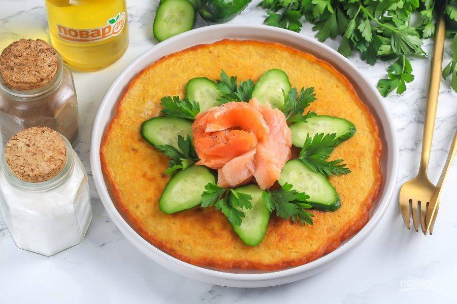 Выложите румяный овсяноблин на тарелку и украсьте по своему вкусу. Можно подать его с красной рыбой, огурцами, соусами и т.д.
