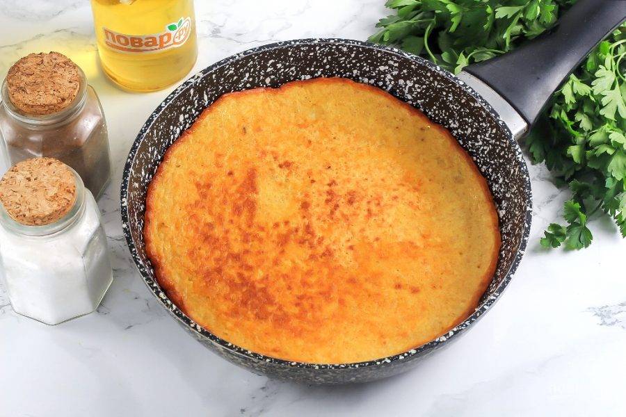 Раскалите масло в сковороде и выложите всю массу на сковороду, аккуратно разровняйте. Обжарьте на умеренном нагреве 3-4 минуты с одной стороны и переверните на другую. Обжарьте еще 3-4 минуты до румяности.