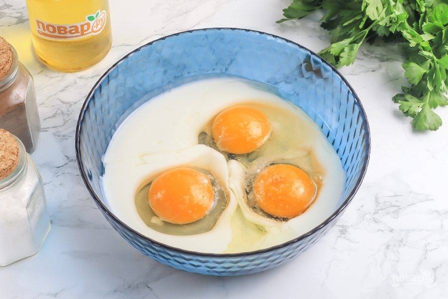 Влейте кефир в глубокую емкость, вбейте куриные яйца и всыпьте соль. По желанию можно добавить и другие пряности, приправы. Взбейте все вилкой или венчиком примерно 1 минуту.