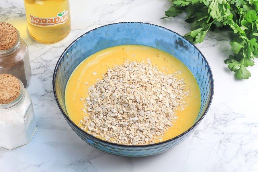 Всыпьте овсяные хлопья и перемешайте. Оставьте их набухать в жидкости 5-7 минут. После чего еще раз перемешайте.