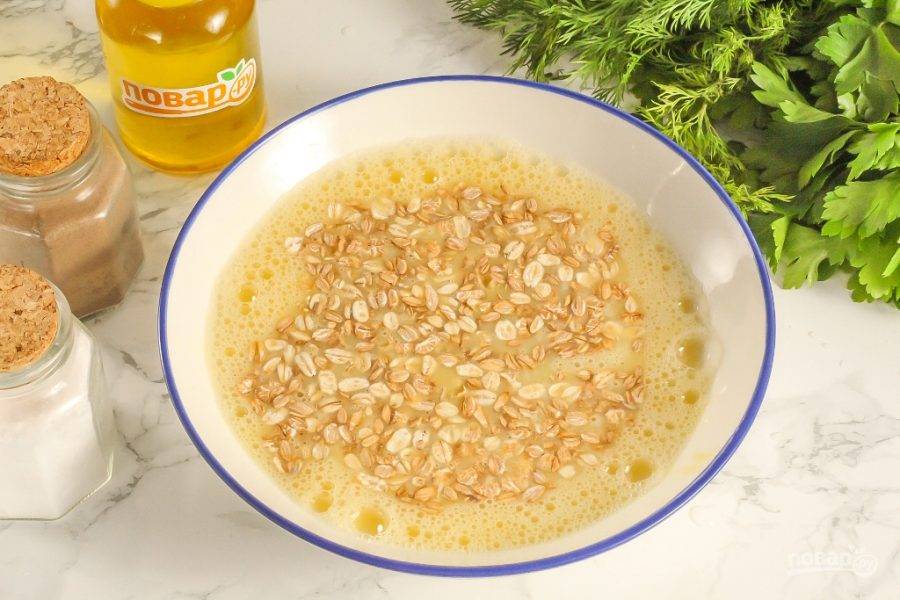 Всыпьте в емкость овсяные хлопья и перемешайте. По желанию можно добавить различные специи и пряности. Оставьте хлопья набухать примерно 3-5 минут.
