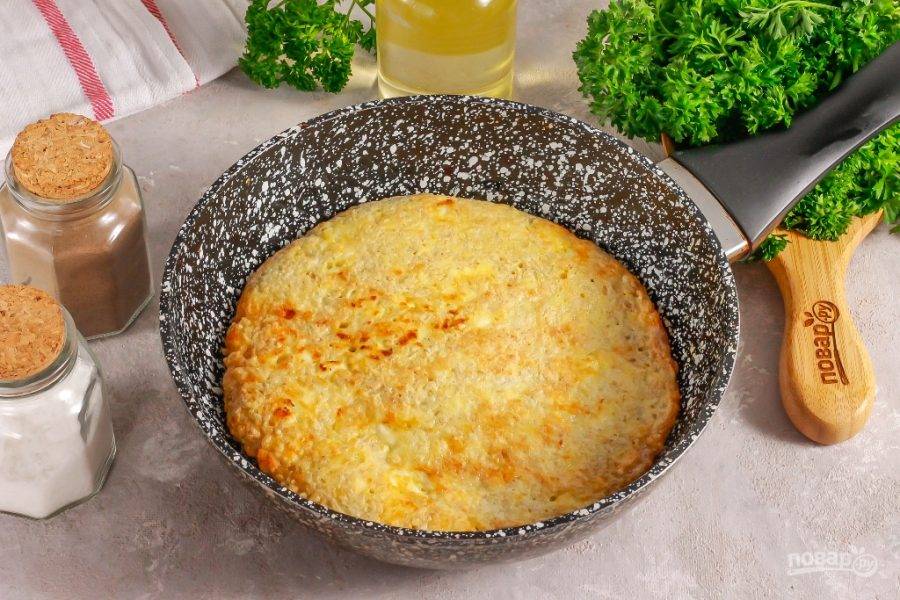 Прогрейте на плите сковороду с растительным маслом и выложите в нее всю массу, разравнивая по дну. Обжарьте примерно 2 минуты до румяности. Не торопитесь переворачивать, чтобы овсяноблин не развалился на части! Ему нужно дать как следует прожариться.