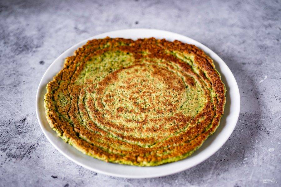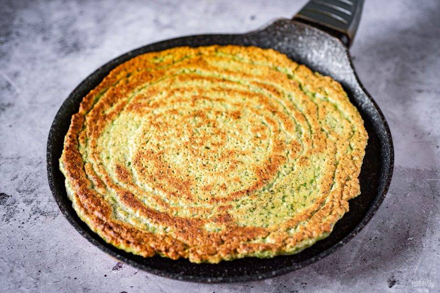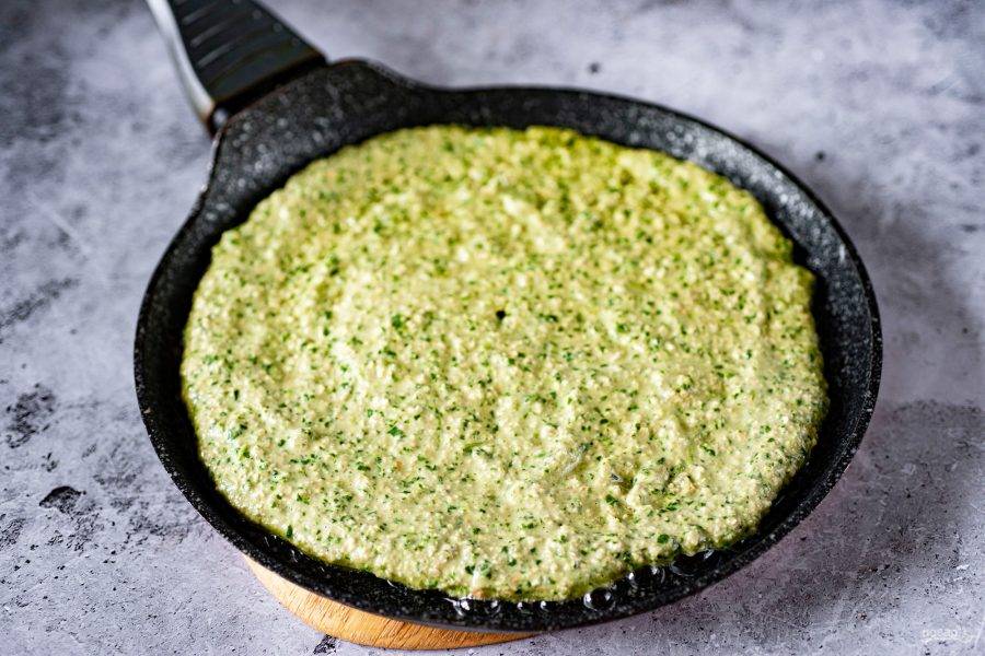 На среднем огне разогрейте сковороду с растительным маслом и выложите шпинатное тесто, разравнивая ложкой и формируя блин.