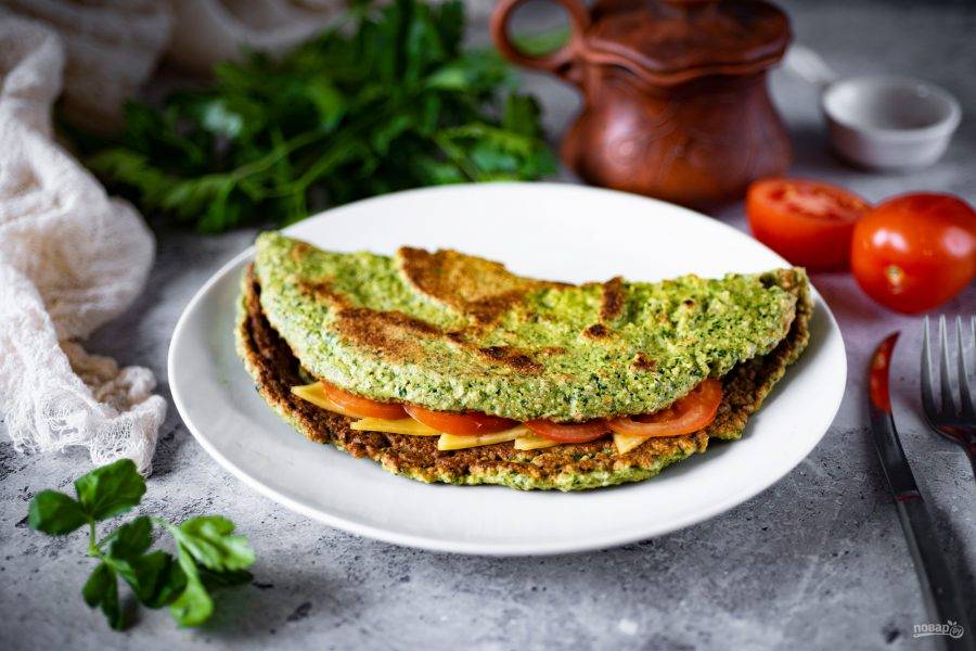 Я положила на одну сторону овсяноблина ломтики сыра и тонкие кружочки томатов, накрыла второй стороной и подала к столу. Приятного аппетита!