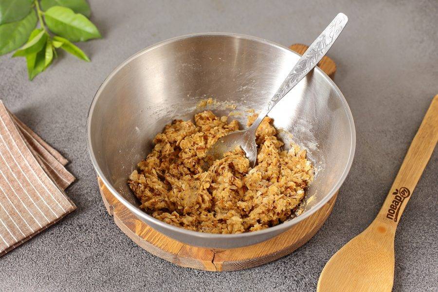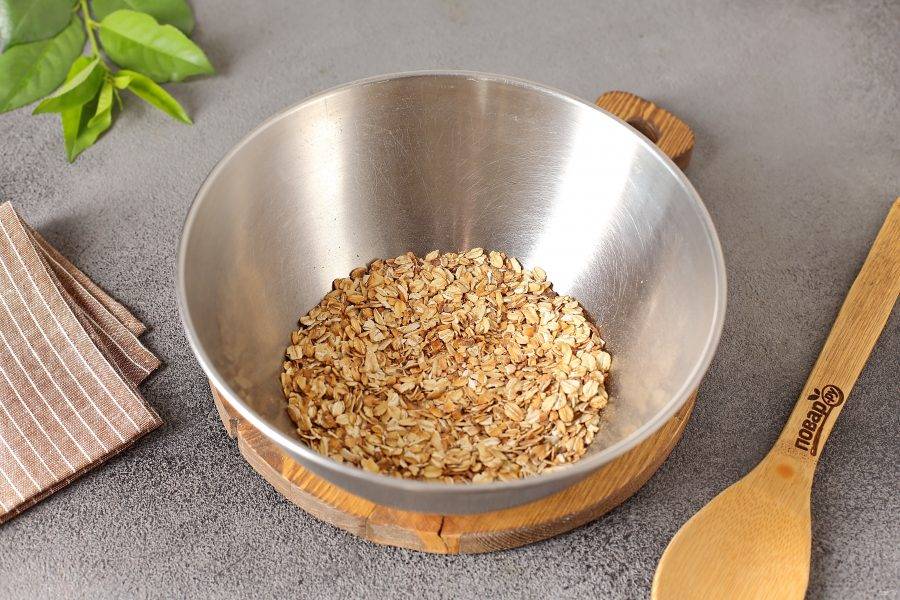 Оставшиеся хлопья поджарьте до золотистого цвета в сухой сковороде и переложите в глубокую миску.