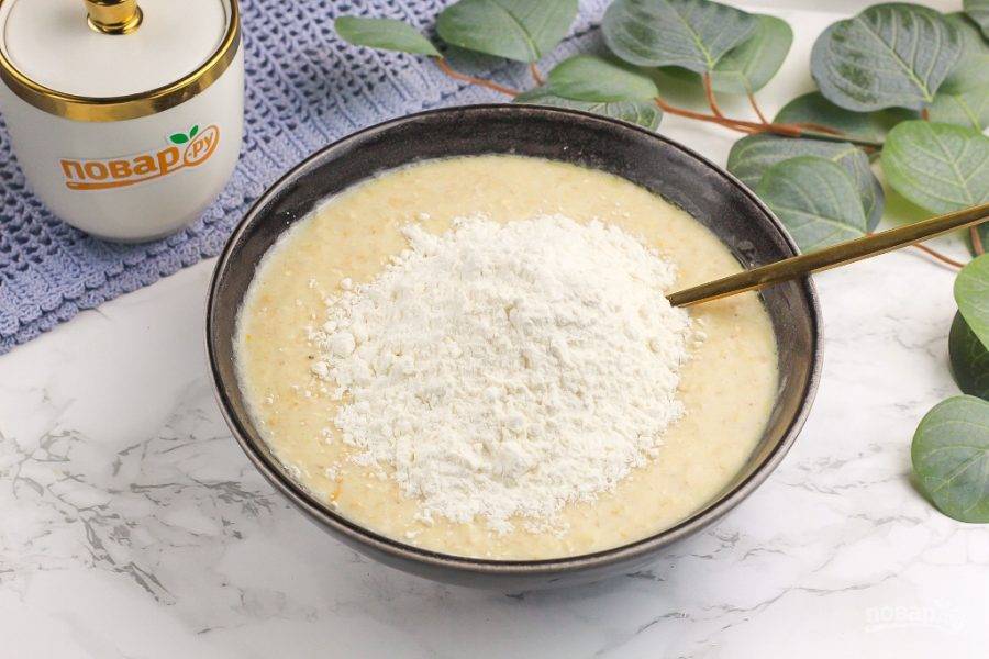 Всыпьте муку высшего сорта по частям и вмешайте ее в овсяную массу. У вас должно получиться не плотное, вязкое овсяное тесто, которое невозможно собрать в комок.