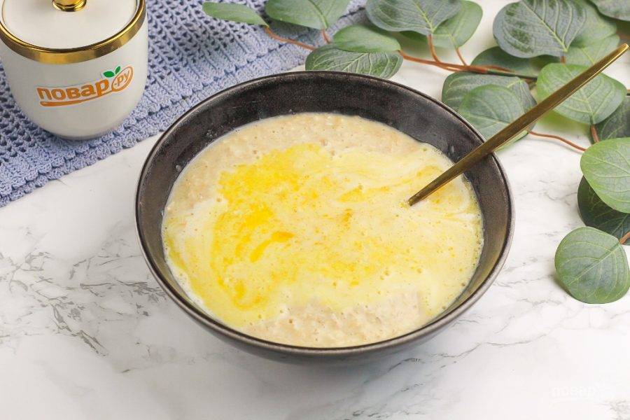 Растопите сливочное масло и влейте в емкость. Аккуратно все перемешайте. Можно заменить сливочное масло качественным маргарином, но не спредом.