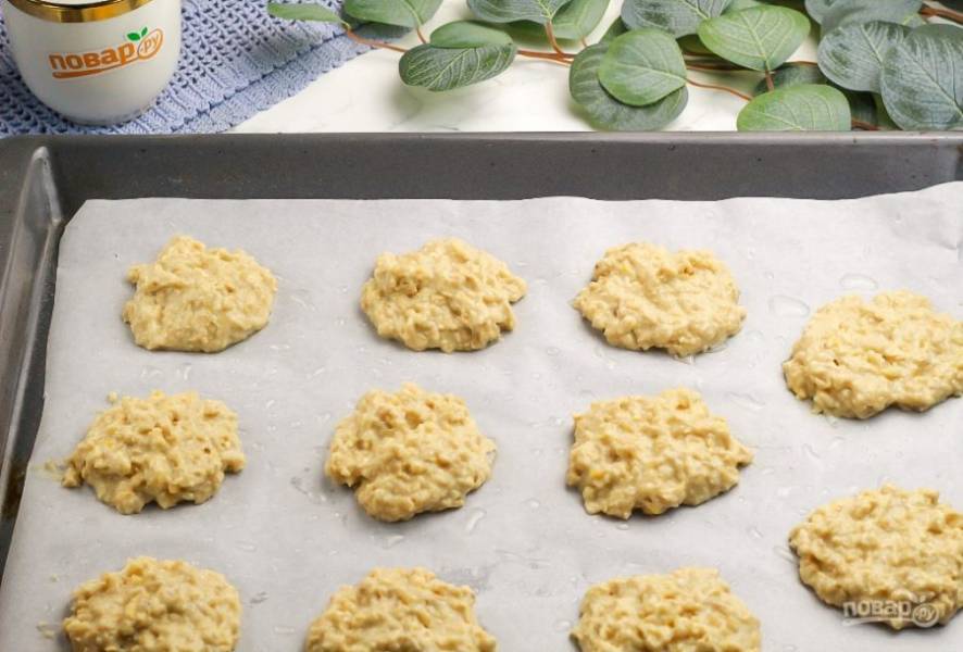 Разогрейте духовку до 180 градусов и застелите пергаментную бумагу на противень. Смажьте ее растительным маслом и выложите с помощью столовой ложки части теста на бумагу. Старайтесь оставлять между заготовками хотя бы 2-3 см., так как десерт слегка увеличится при выпекании. Поместите противень в духовку на средний уровень.