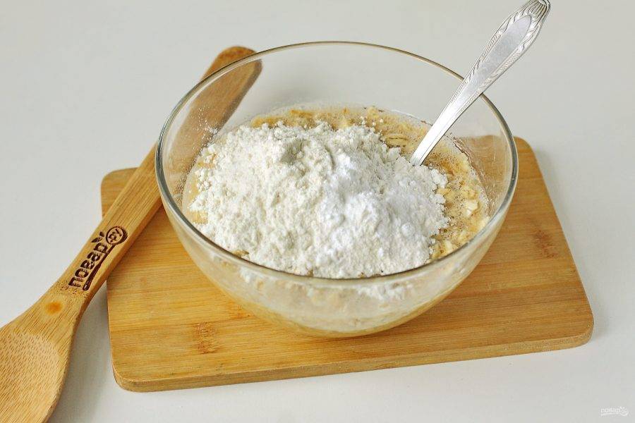 Все перемешайте, добавьте муку и разрыхлитель.