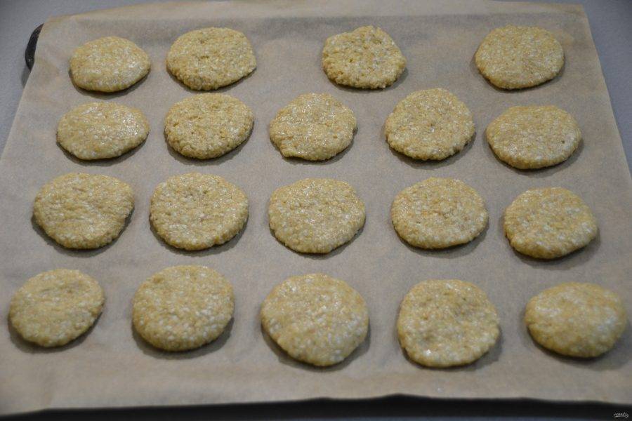 Отделите кусочек теста размером с грецкий орех. Сделайте из него лепешку и укладывайте на бумагу для выпечки, оставляя расстояние между печеньем.