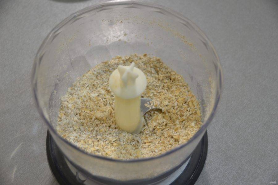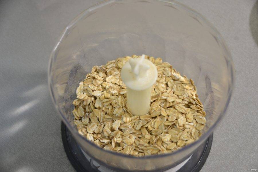 Соедините измельченные овсяные хлопья, пшеничную муку, добавьте разрыхлитель для теста и ванильный сахар.