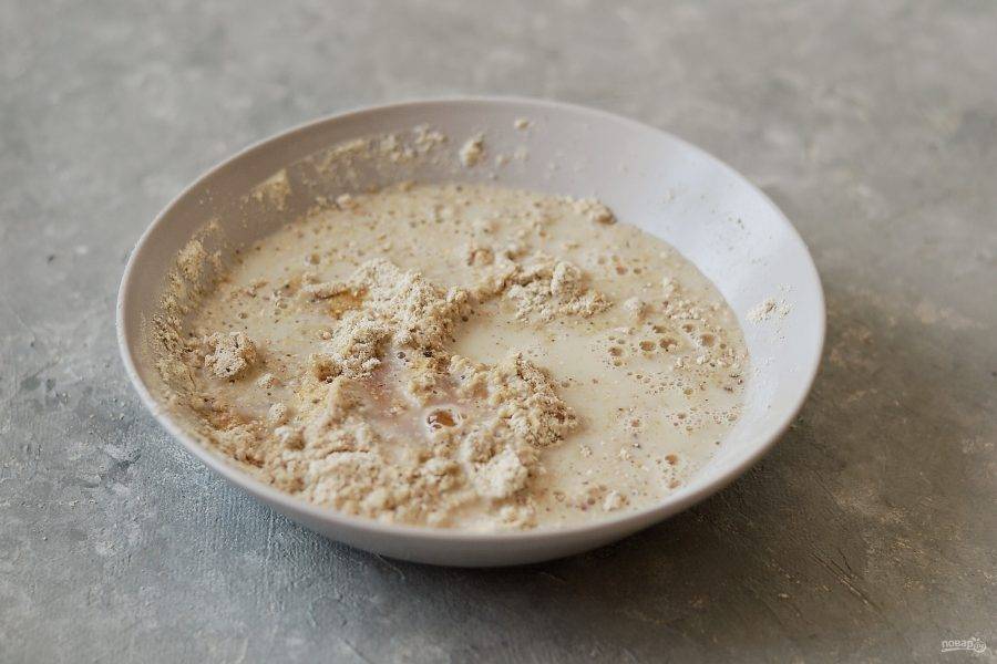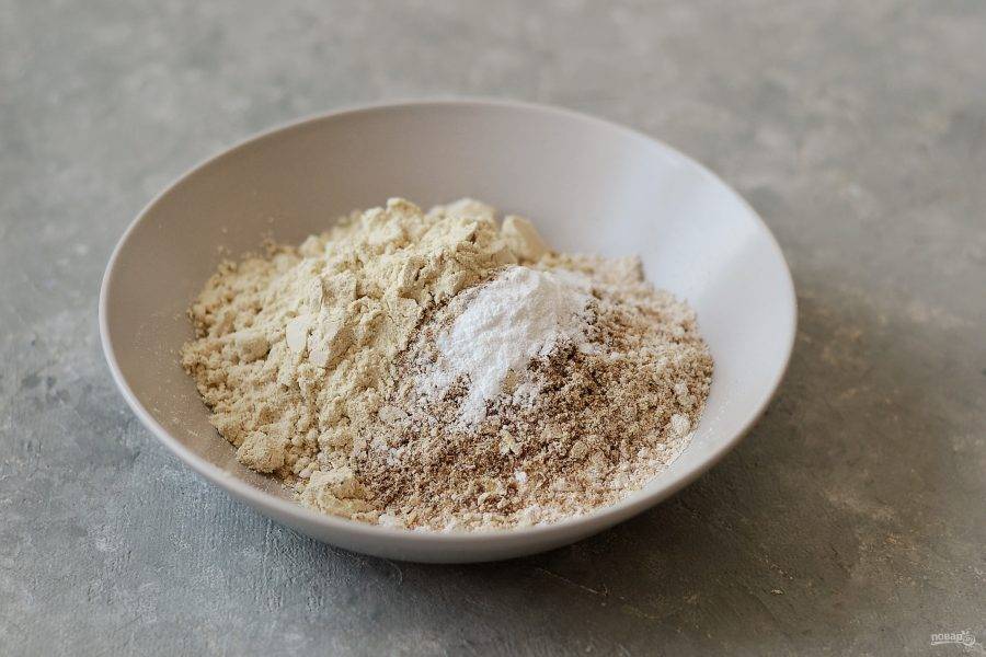Измельчите в кофемолке овсяные хлопья и льняные семечки. Смешайте все сухие ингредиенты в миске.