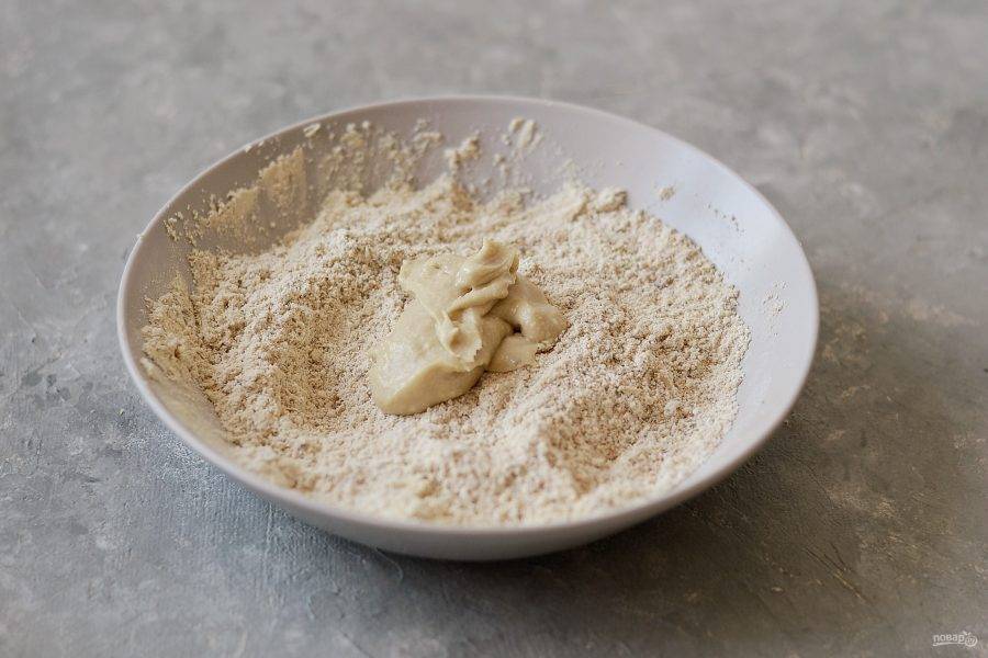 Добавьте ореховую пасту. Разотрите в крошку.