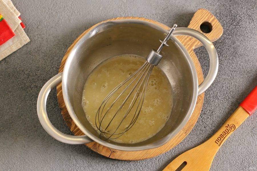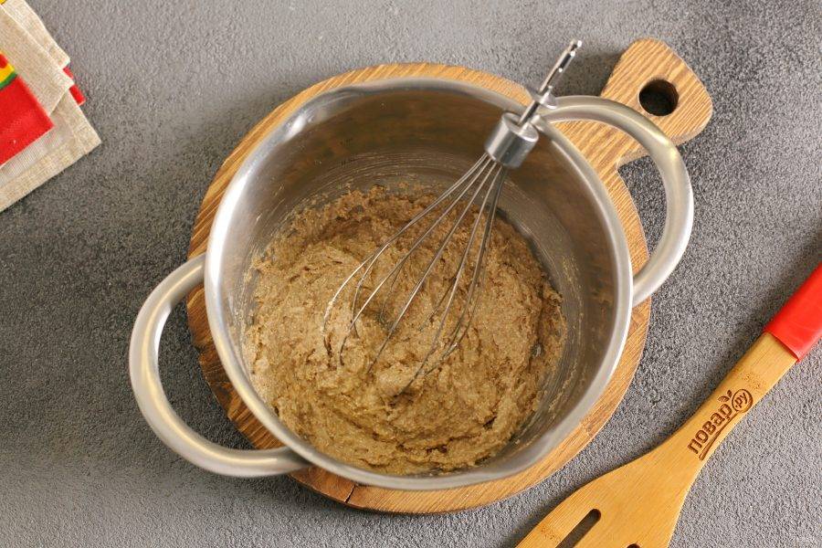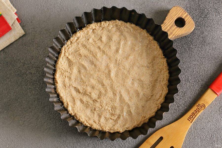 Форму для выпечки смажьте маслом, выложите тесто и разровняйте его ложкой или просто влажными руками. Подходящий размер формы 18-22 см. в диаметре.
