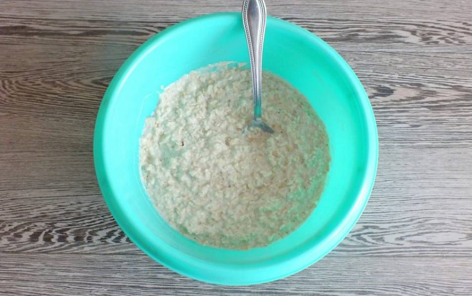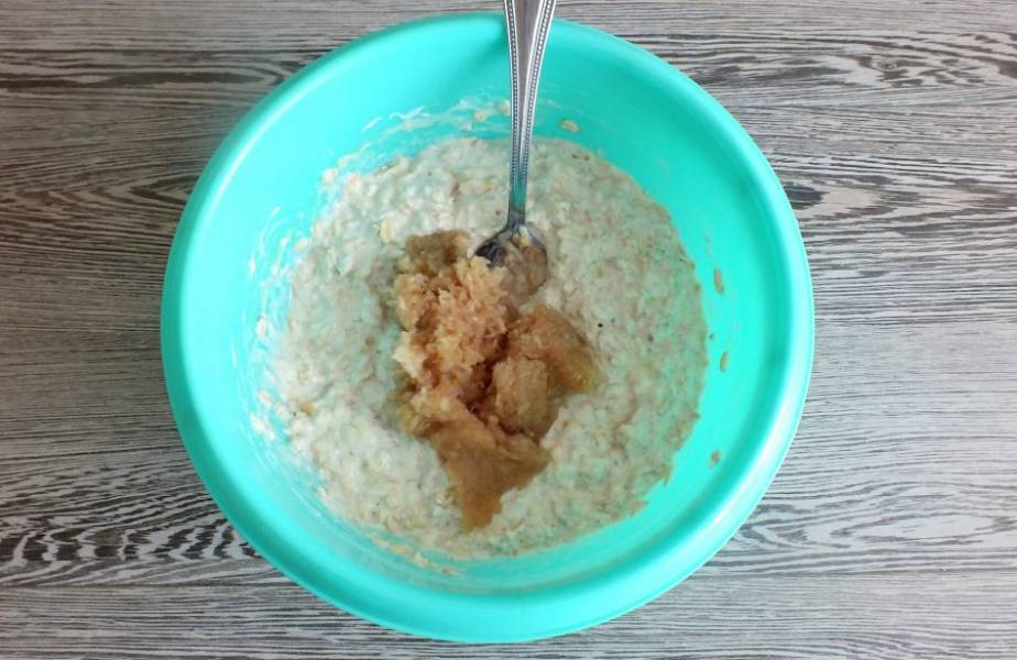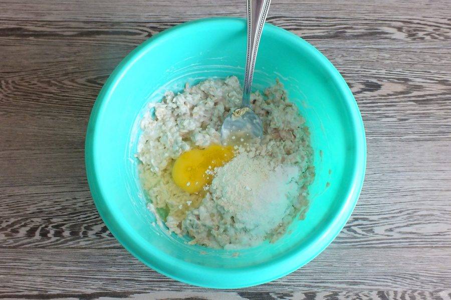 По истечении времени, добавьте муку, яйцо, разрыхлитель для теста. Перемешайте.