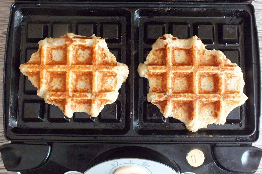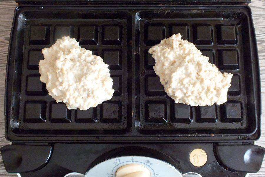 Панели вафельницы обильно смажьте растительным маслом. Выложите по столовой ложке с горкой на каждую вафлю. Прикройте крышкой. Выпекайте 5-7 минут на среднем уровне.