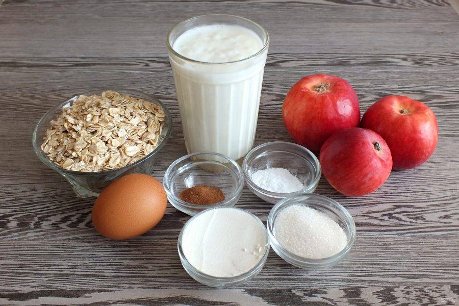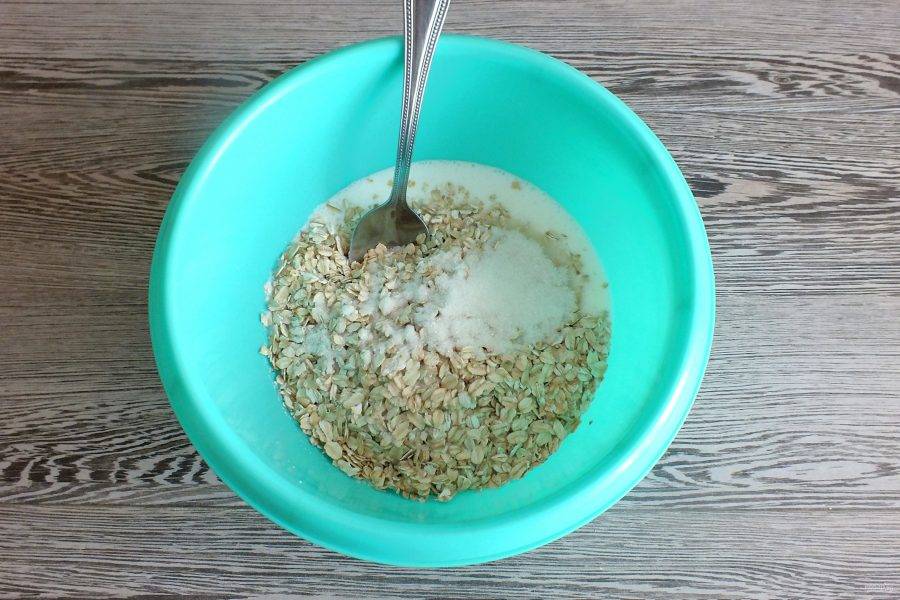 В чаше смешайте кефир, сахар и овсянку. Перемешайте, оставьте на 30 минут для набухания.
