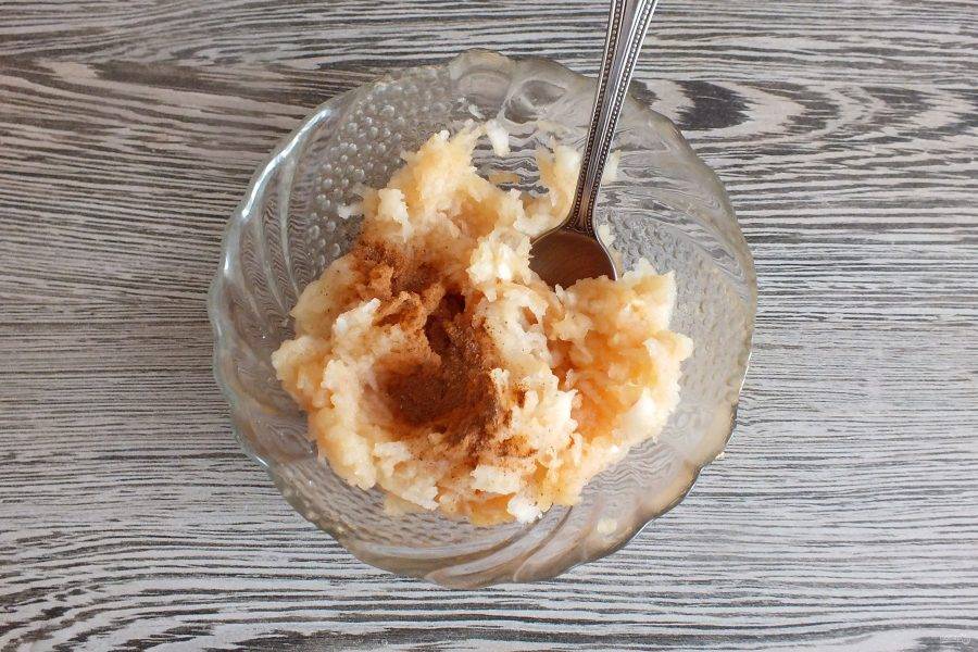 Яблоки очистите от кожуры, удалите семенную коробочку. Натрите на мелкой тёрке, добавьте корицу и хорошо перемешайте.