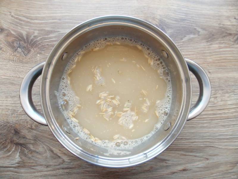 Отфильтрованную воду вскипятите и остудите. Всыпьте в кастрюлю с водой измельченный овес и перемешайте.