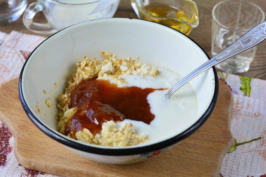 Добавьте варенье, и перемешайте тесто. С кефиром и вареньем хлопья начнут набухать. Сахар можно не добавлять, если варенье сладкое. У меня было абрикосовое варенье. Лучше, когда варенье жидковатое и не сильно густое.