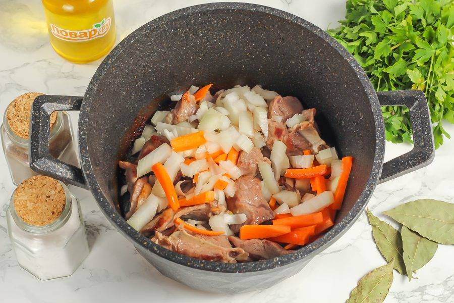 Добавьте лук и морковь и обжарьте еще 3-4 минуты.