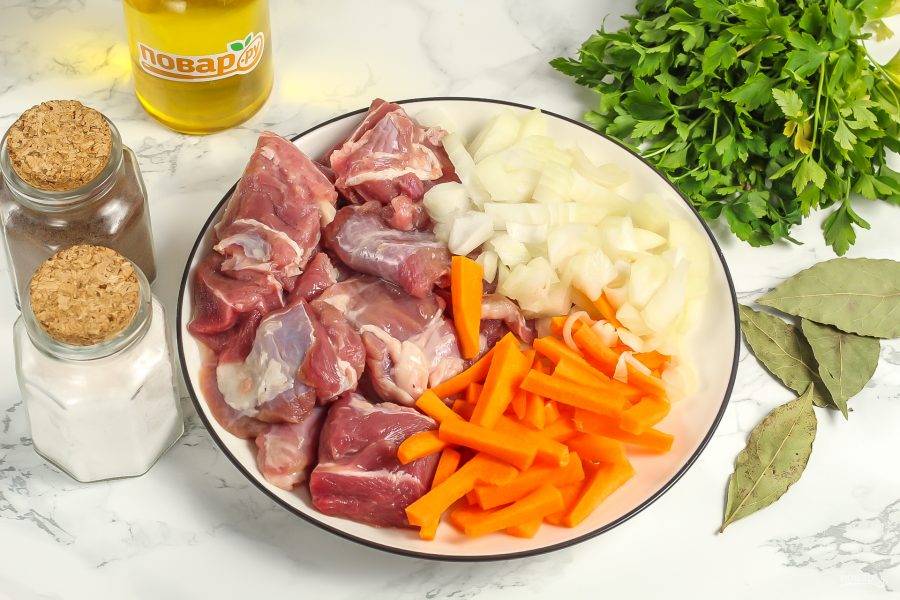 Промойте баранину в воде, срежьте с мяса жилы и пленки. Очистите морковь и лук от кожуры, промойте в воде вместе с мясом. Нарежьте баранину крупными кусочками, лук — мелкими кубиками, а морковь — средними брусочками.