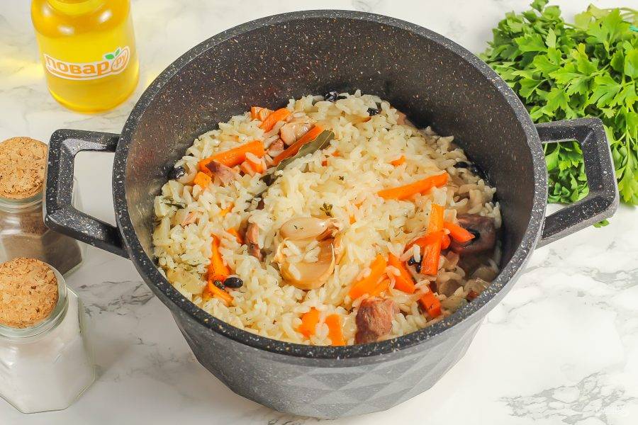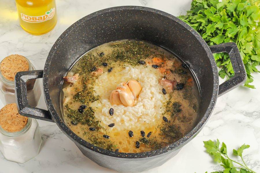 Выложите в середину казана промытый рис, всыпьте все специи, сушеную зелень, выложите в центр промытый чеснок прямо в шелухе. Накройте емкость крышкой и убавьте нагрев до умеренного.
