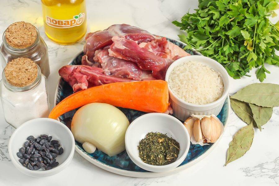 Подготовьте указанные ингредиенты. Баранину выбирайте с косточкой, чтобы бульон получился наваристым.