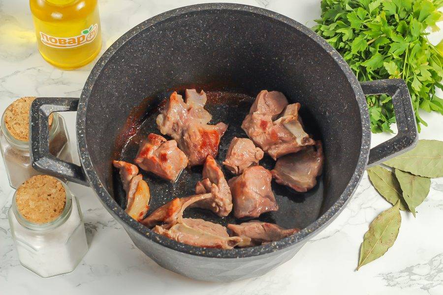 Влейте в казан растительное масло и выложите кусочки баранины. Обжарьте в течение 10-12 минут, время от времени перемешивая, чтобы мясо равномерно поджарилось.