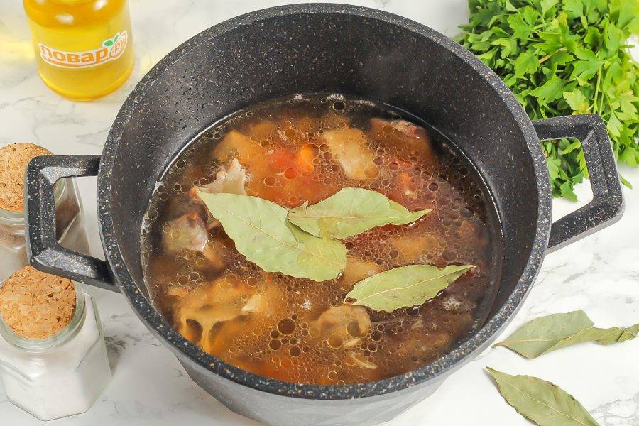 Влейте горячую воду, всыпьте лавровые листья и отварите мясо в течение 15-20 минут.