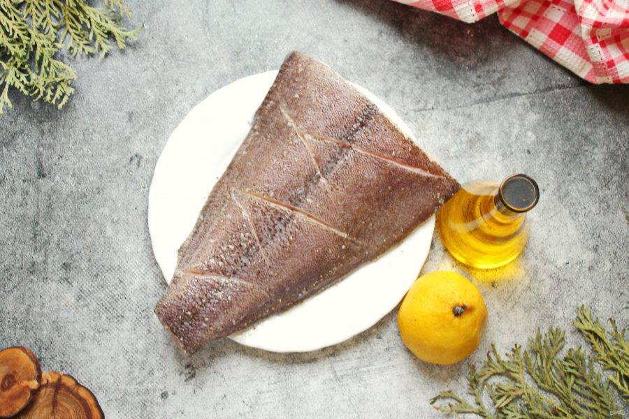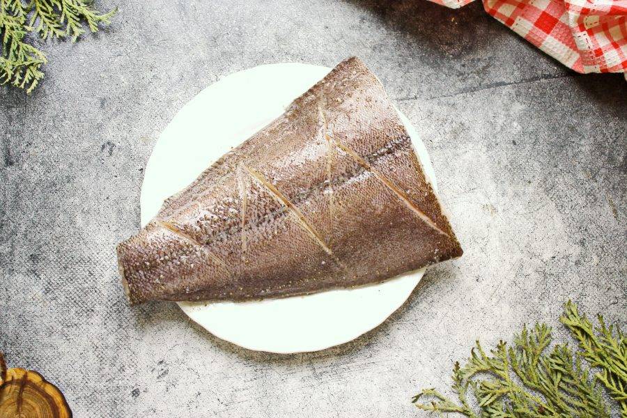 У палтуса отстригите плавники, почистите от чешуи и сполосните. Я обрезала верх, чтобы рыба вошла в форму. Сделайте разрезы с двух сторон по всей поверхности, не прорезая кость.