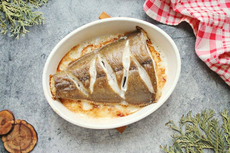 Форму для запекания смажьте растительным маслом и выложите палтус. Форму с рыбой поставьте в горячую духовку и запекайте при температуре 180 градусов в течение 35-45 минут, до готовности. Готовый палтус достаньте из духовки и сразу подавайте к столу.