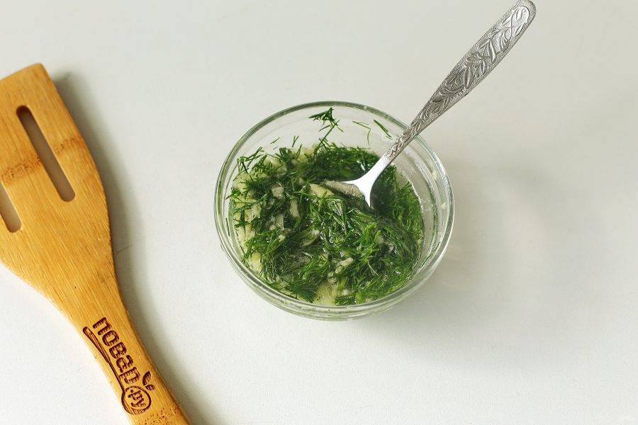 Приготовьте соус. Для этого соедините воду и растительное масло. Добавьте пропущенный через пресс чеснок, соль по вкусу и нарезанный укроп. Все хорошо перемешайте.